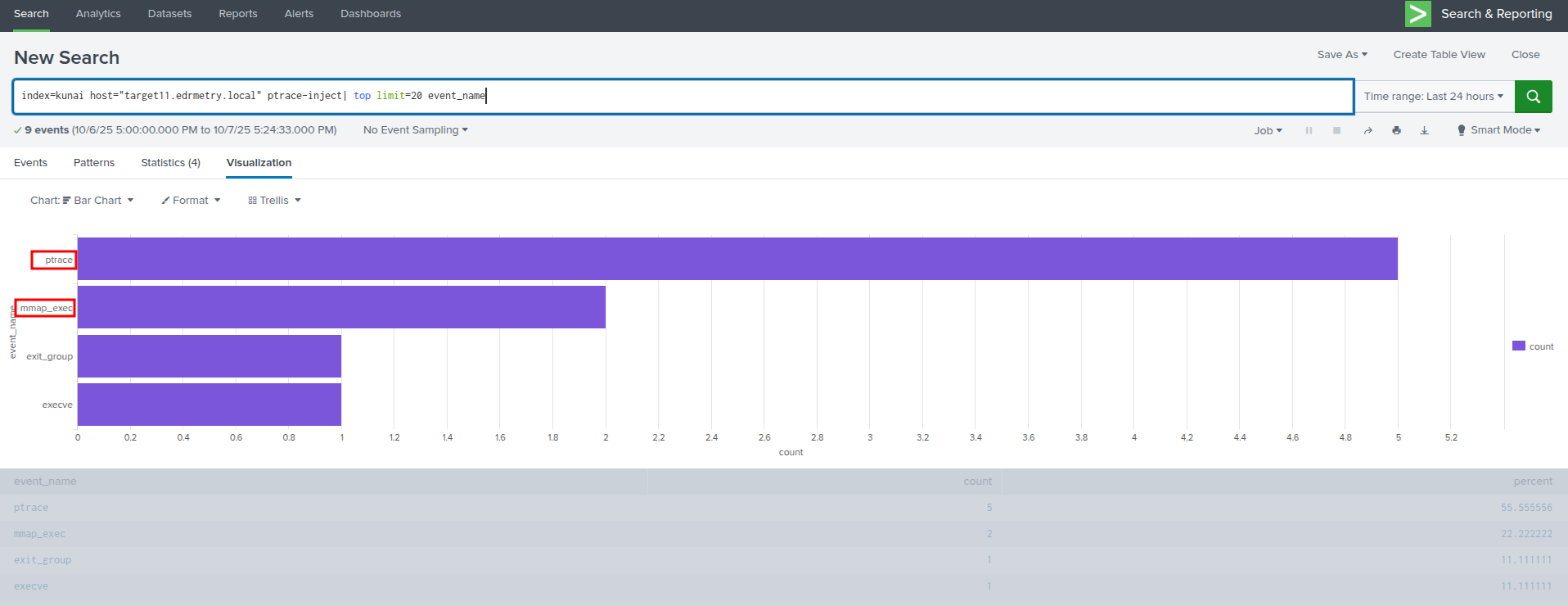 Kunai provides syscall-level visibility that sneaky_remap cannot evade. When ptrace-inject attaches to the target process, Kunai logs the ptrace syscall with full context including the attacker's PID, the target PID, and the ptrace operation being performed. The subsequent memory writes and the dlopen-equivalent operations that load the library all generate events.
