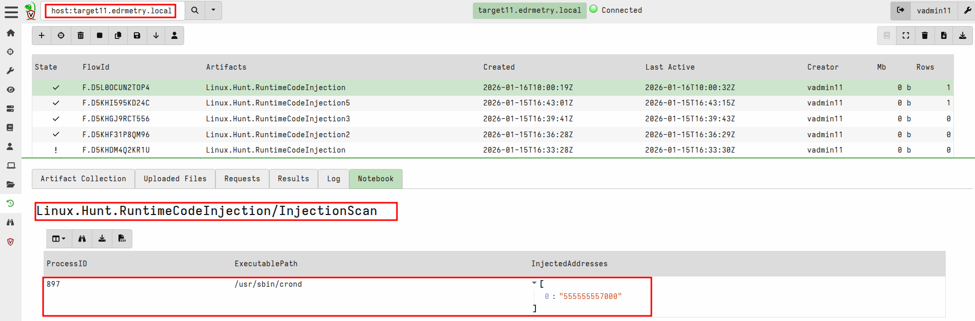EDR-T6370 - This test uses ptrace-inject - a tool for injecting code into a running process using ptrace() with a combination of sneaky_remap and a custom SSL/TLS Reverse shell callback. ptrace-inject injects a reverse shell shared library into a running process, and sneaky_remap hides the name of a loaded shared object file (library). The general idea is to copy the readable pages from the library's file to new anonymous pages, keeping the same permissions. Then it uses mremap(2) to copy back over the relevant pages from the shared object file, unmapping the file in the process. The final result is that the library now shows up as anonymous memory in /proc/pid/maps, effectively being invisible from locations below: