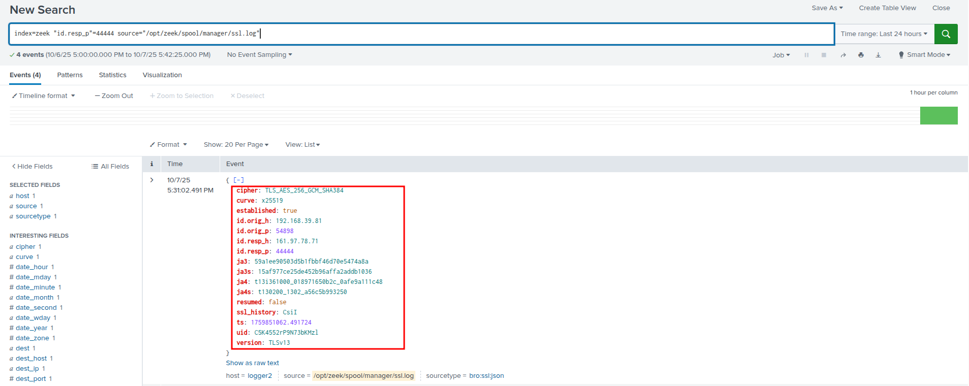 Zeek captures the network side of the attack comprehensively. The TLS connection to the attacker's server appears in ssl.log with certificate information, connection duration, and data volumes. Connections on unusual ports like 44444 from processes that should not be making such connections warrant immediate investigation.