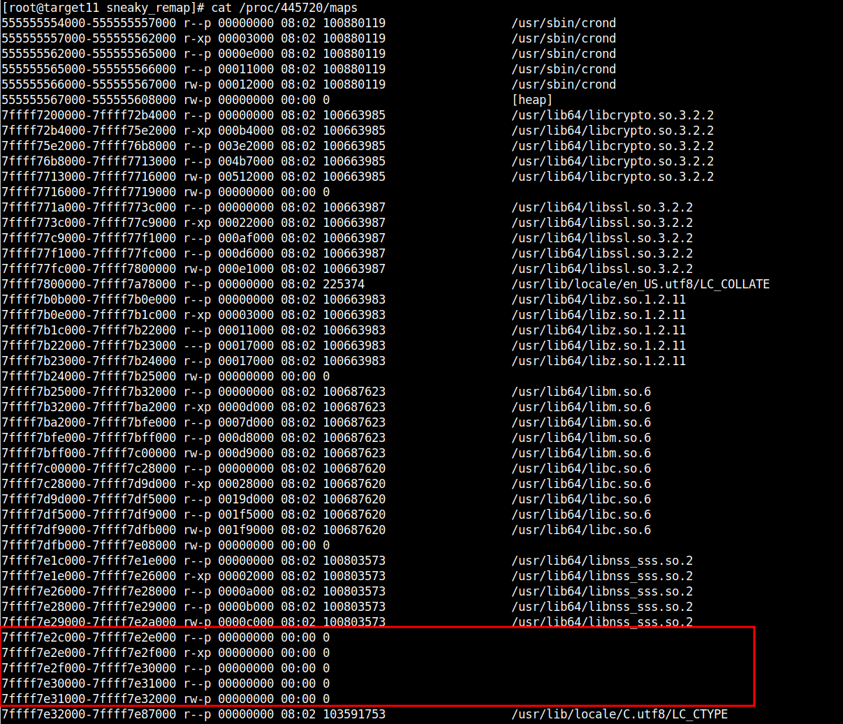Additionally, the spawned sh process is masqueraded as ps uax ;-) Long story short, sneaky_remap stealthily remaps the shared object file to avoid being seen in /proc/pid/maps.
