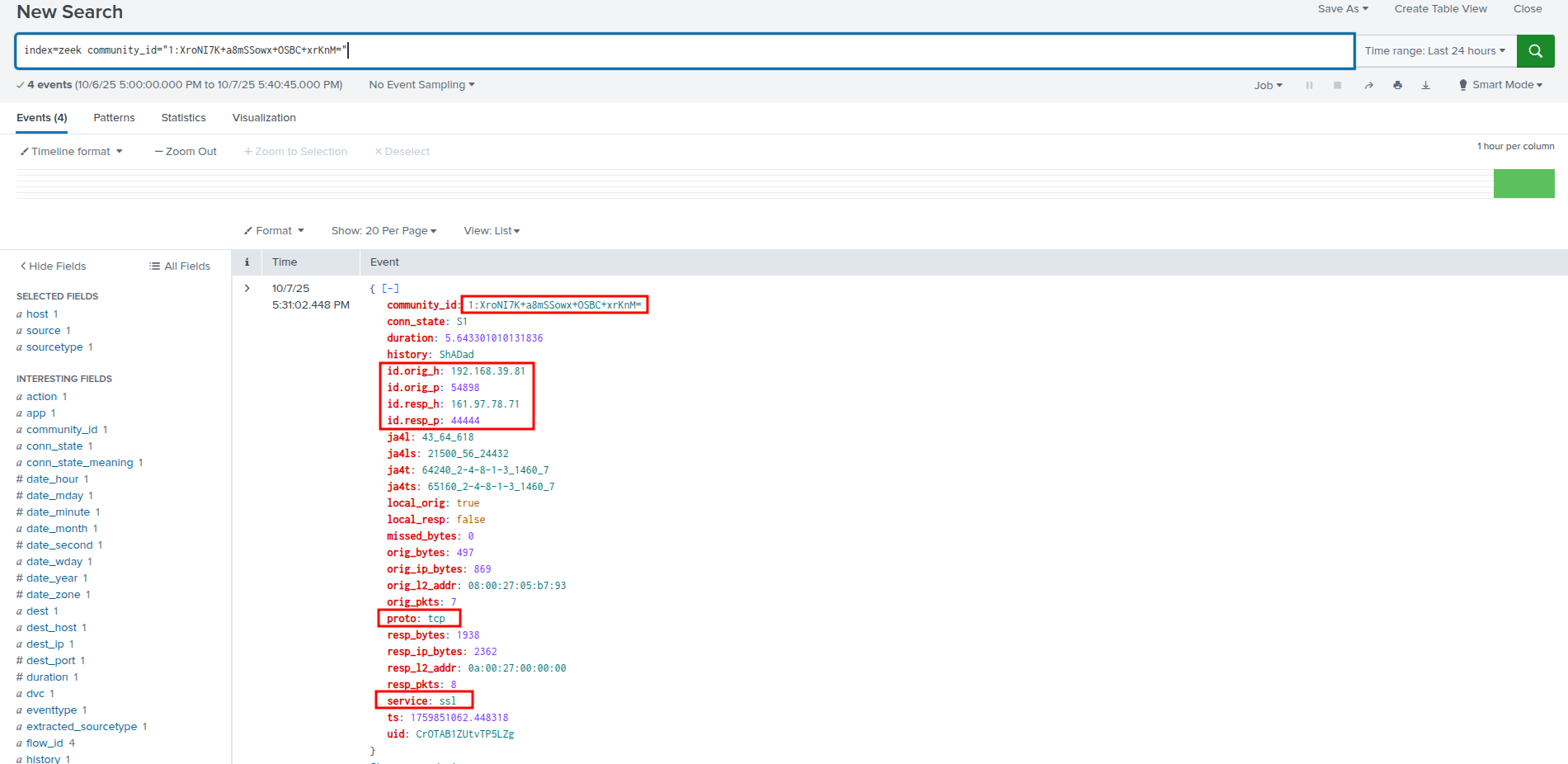 Zeek's community ID feature allows correlation across different log types, linking the suspicious connection to other network activity from the same session.