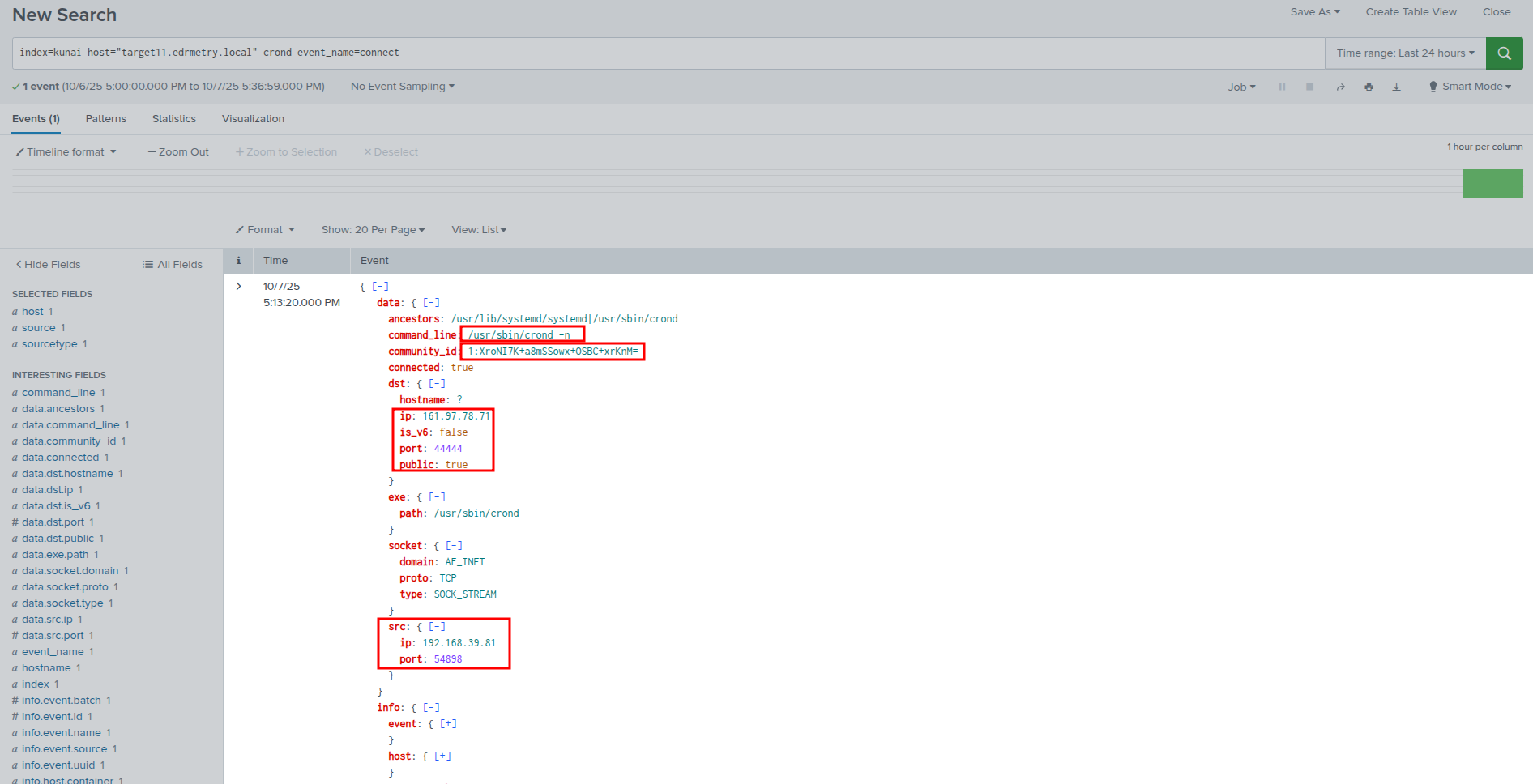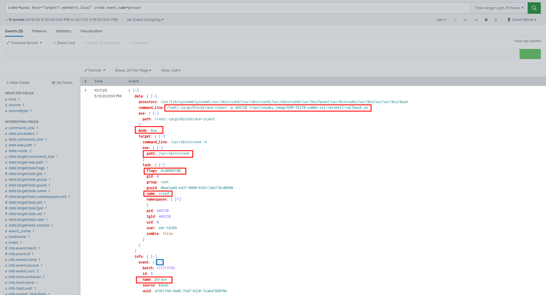 When the injected library establishes its network connection, Kunai captures the connect() syscall with the destination IP and port. The correlation is damning: a ptrace attach to crond, followed shortly by crond making an outbound TLS connection to a foreign IP.