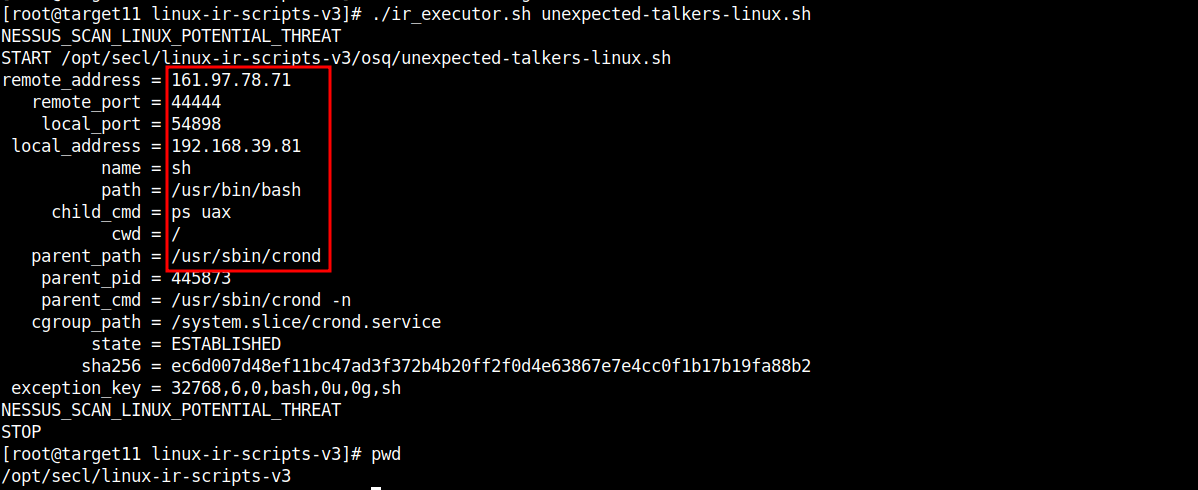 The process's /proc directory, while manipulated, still contains useful artifacts. The /proc/pid/exe symlink points to the original executable. The /proc/pid/cmdline shows command arguments. The /proc/pid/fd directory reveals open file descriptors including network sockets.