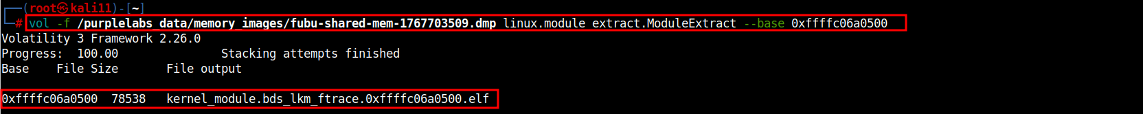 # vol -f /purplelabs_data/memory_images/fubu-shared-mem-1767703XXX.dmp linux.module_extract.ModuleExtract --base 0xffffc06a0500CLI: