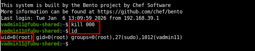 uid=0(root) gid=0(root) groups=0(root),27(sudo),1012(vadmin11)@ TARGET_X: