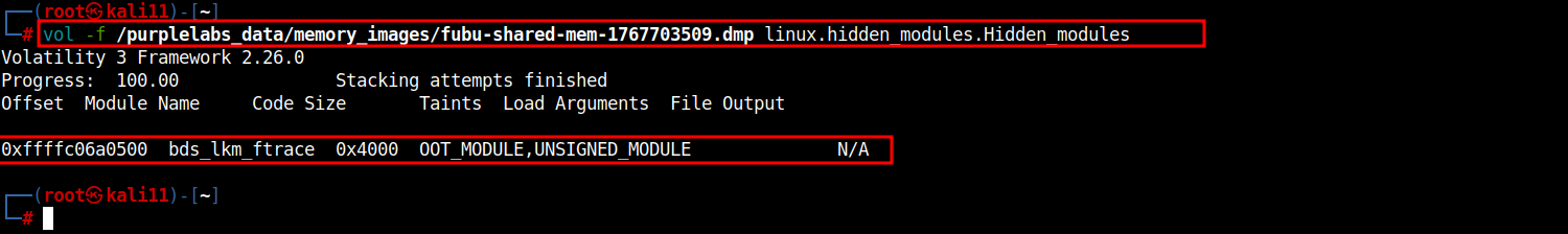 # vol -f /purplelabs_data/memory_images/fubu-shared-mem-1767703XXX.dmp linux.hidden_modules.Hidden_modulesVolatility3 Framework: