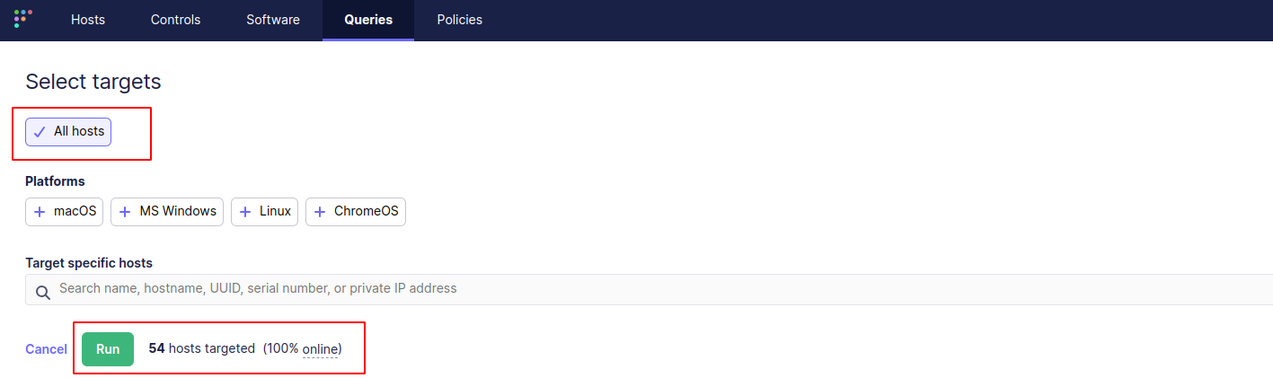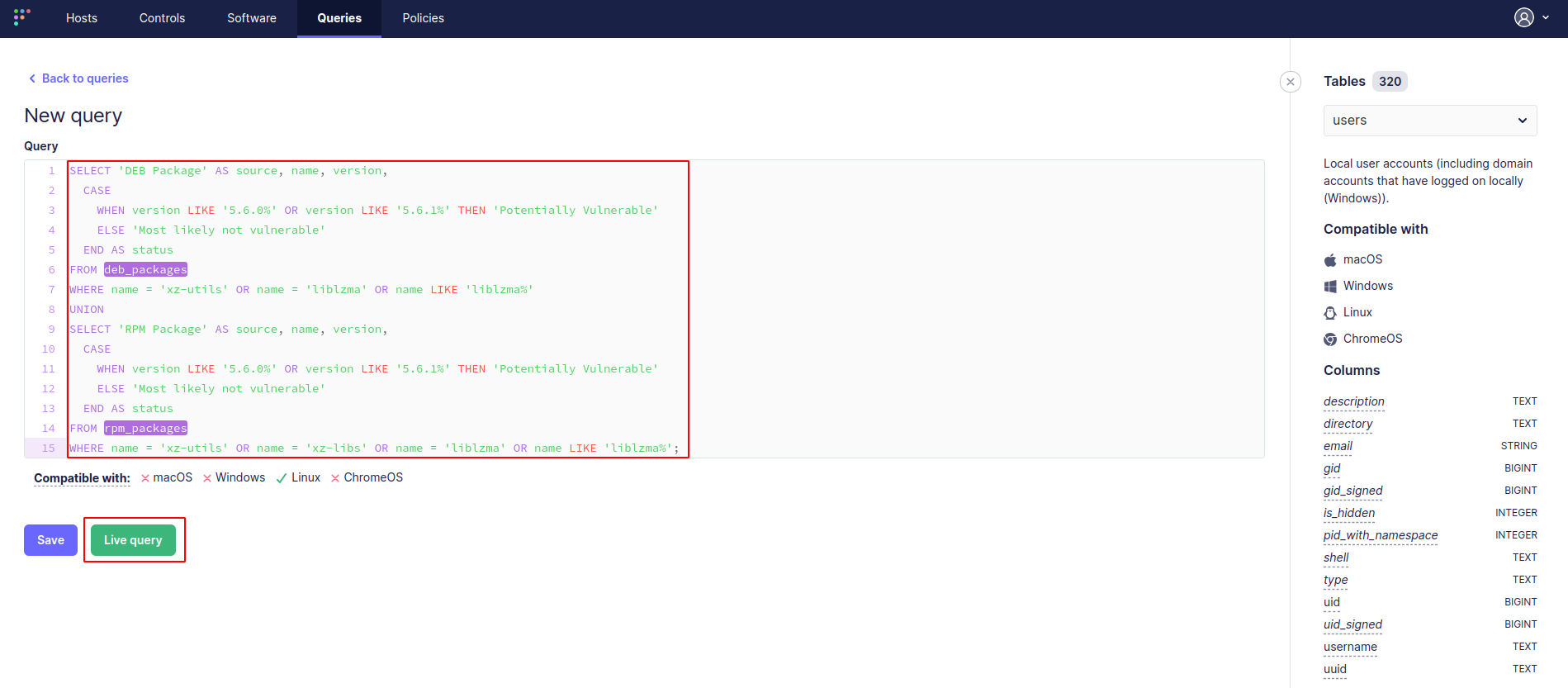 WHERE name = 'xz-utils' OR name = 'xz-libs' OR name = 'liblzma' OR name LIKE 'liblzma%';2. Click on Live query and choose All hosts then Run: