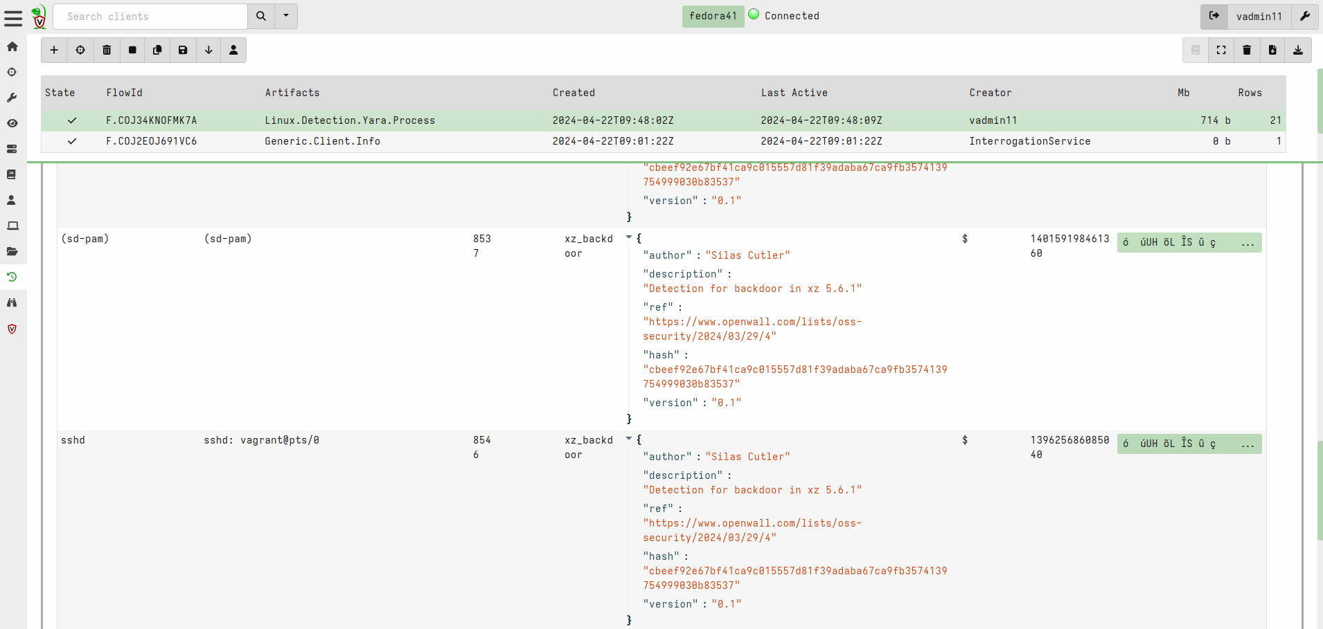 5. You can also use Velociraptor to run Linux.Detection.Yara.Process with the corresponding Yara rule. In Search clients use host:fedora41 , paste the rule and execute.