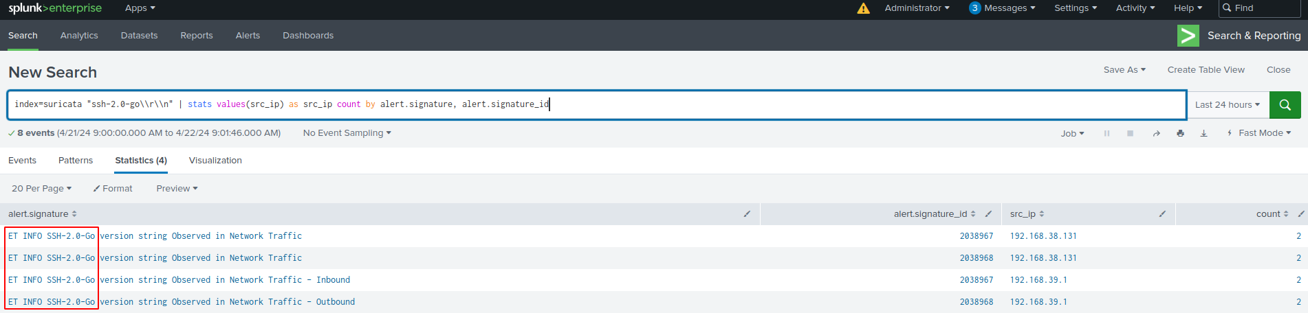 18. Use Splunk and check index=suricata for corresponding signature alerts: