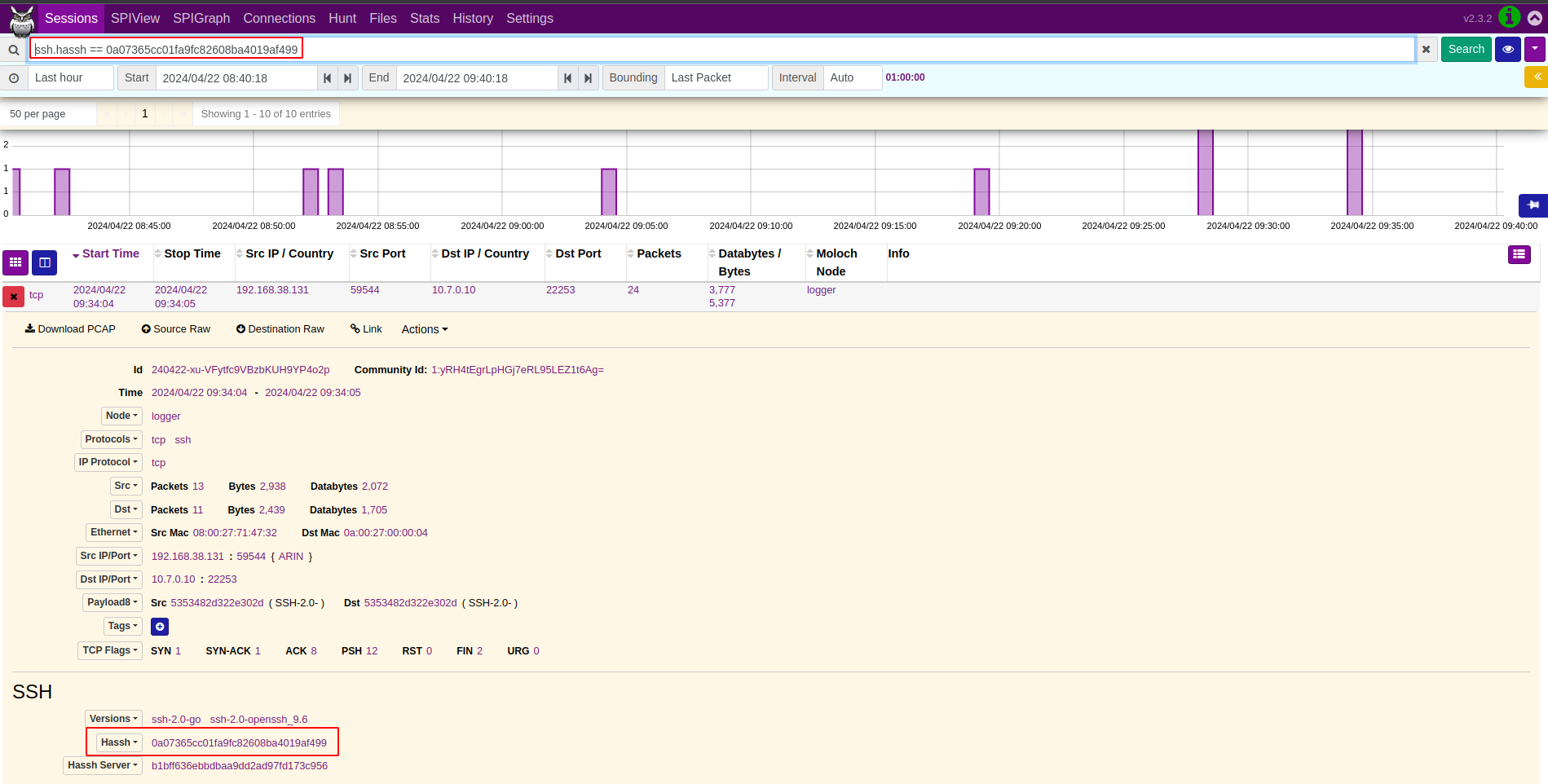 index=suricata "ssh-2.0-go\\r\\n" | stats values(src_ip) as src_ip count by alert.signature, alert.signature_id19. Pivot to Moloch/Arkime Full Packet Capture and hunt for the HASSH fingerprint of xzbot which is an ssh client in this case: