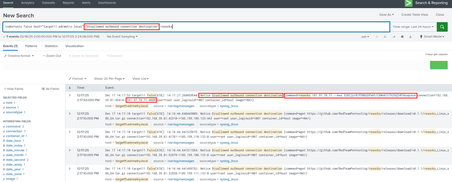 index=unix falco host="targetX.edrmetry.local" "Disallowed outbound connection destination" resocksSplunk - Falco Runtime Security: