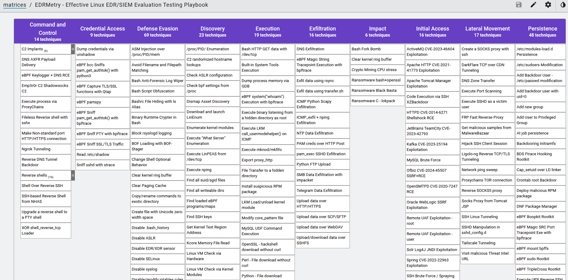 Learn current trends, techniques, and offensive tools for Discovery, C2, Lateral Movement, Persistence, Evasion, Exfiltration, Execution, and Credential Access against Linux machines ← Matrix ATT&Ck Framework